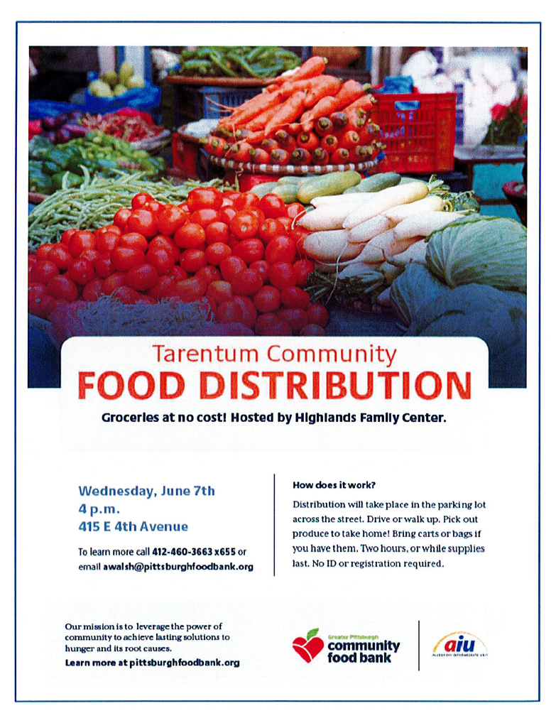 A food distribution event will be hosted by the Highlands Family Center on Wednesday June 7th at 4:00 PM at 415 East 4th Avenue.