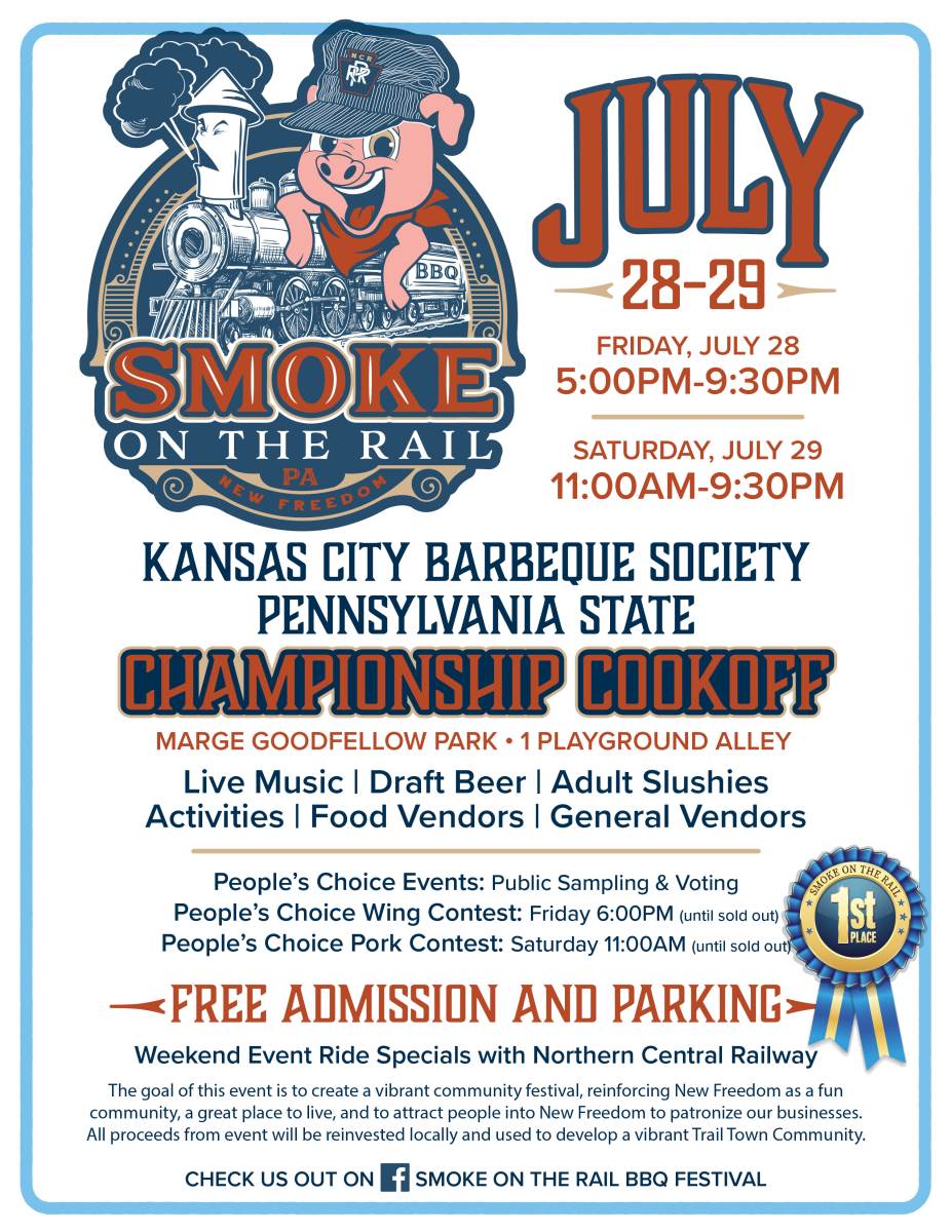 New Freedom Borough and Northern Central Railway welcome Smoke on the Rail BBQ Festival, a Kansas City Barbeque Society State Championship paired with a community festival in the heart of New Freedom. Backyard and Master Series teams will fill Marge Goodfellow Park during the last weekend of July and test their pitmaster skills to find out who prepares the best chicken, ribs, pork, and brisket. Steak Cookoff Association cooks and teams will also battle for the best cooked ribeye and ancillary category of anything with crab meat. While the teams compete, the public will enjoy great food, music, vendors, and activities.