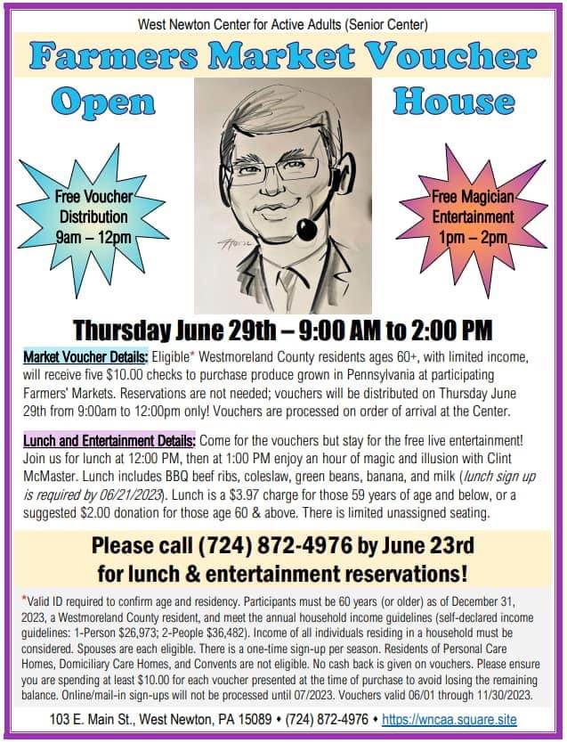 Farmers Market Voucher Open House on Thursday June 29th. The Westmoreland County Area Agency on Aging will be at the West Newton Senior Center from 9:00am to 12:00pm to process farmers market vouchers for 2023. Eligible seniors will receive five $10.00 vouchers (a total of $50 in vouchers) to purchase produce grown in Pennsylvania. This is more than double last years amount. Support local farming in Pennsylvania and give your checkbook a much needed break. Any eligible Westmoreland County resident is able to sign up at the West Newton Senior Center the morning of 06/29.