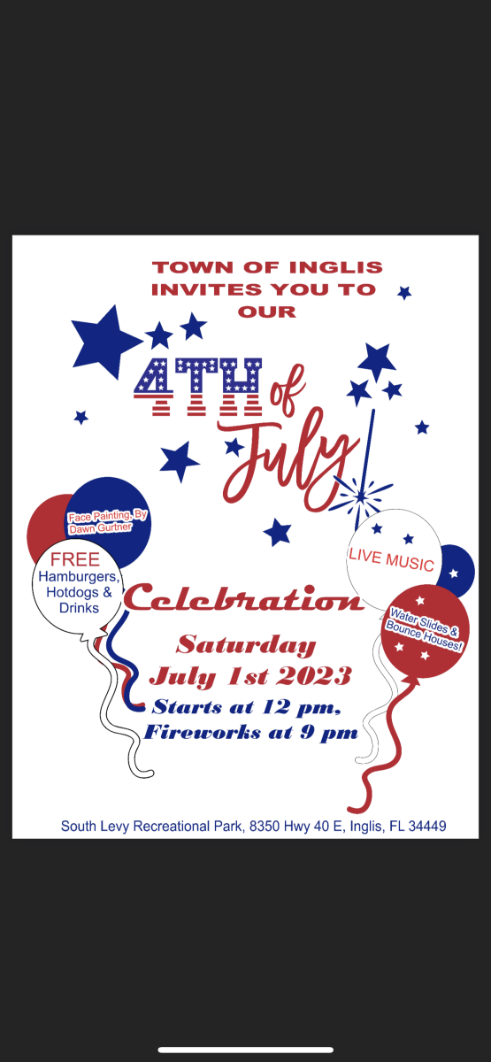The Town of Inglis invites you to our 4th of July celebration which will be held at the South Levy Recreational Park. See Attachment for more information