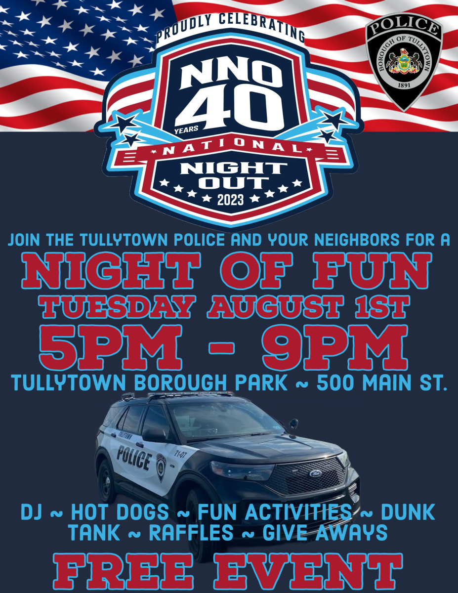 Join Tullytown Police and your Neighbors for a Night of Fun, Tuesday, August 1, 2023 from 5 PM to 9 PM at Tullytown Borough Park, 500 Main Street. Activities include: DJ, Dunk Tank, Obstacle Course, Games, Fire Truck Rides, K-9 Demonstrations and much more.