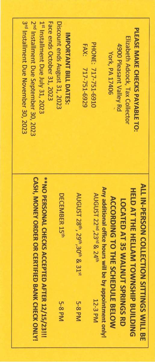 All in-person tax collection sittings will be held at the Hellam Township Municipal Complex, located at 35 Walnut Springs Road York, PA 17406, according to the schedule below: