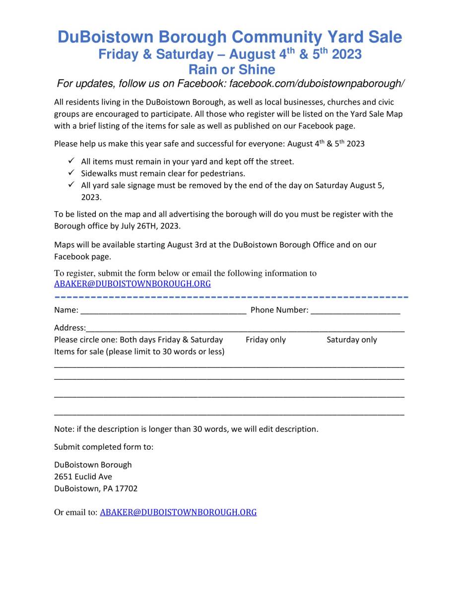 If you would like to participate in the event and have your sale listed on the map please fill out a form and return to the borough office or email abaker@duboistownborough.org