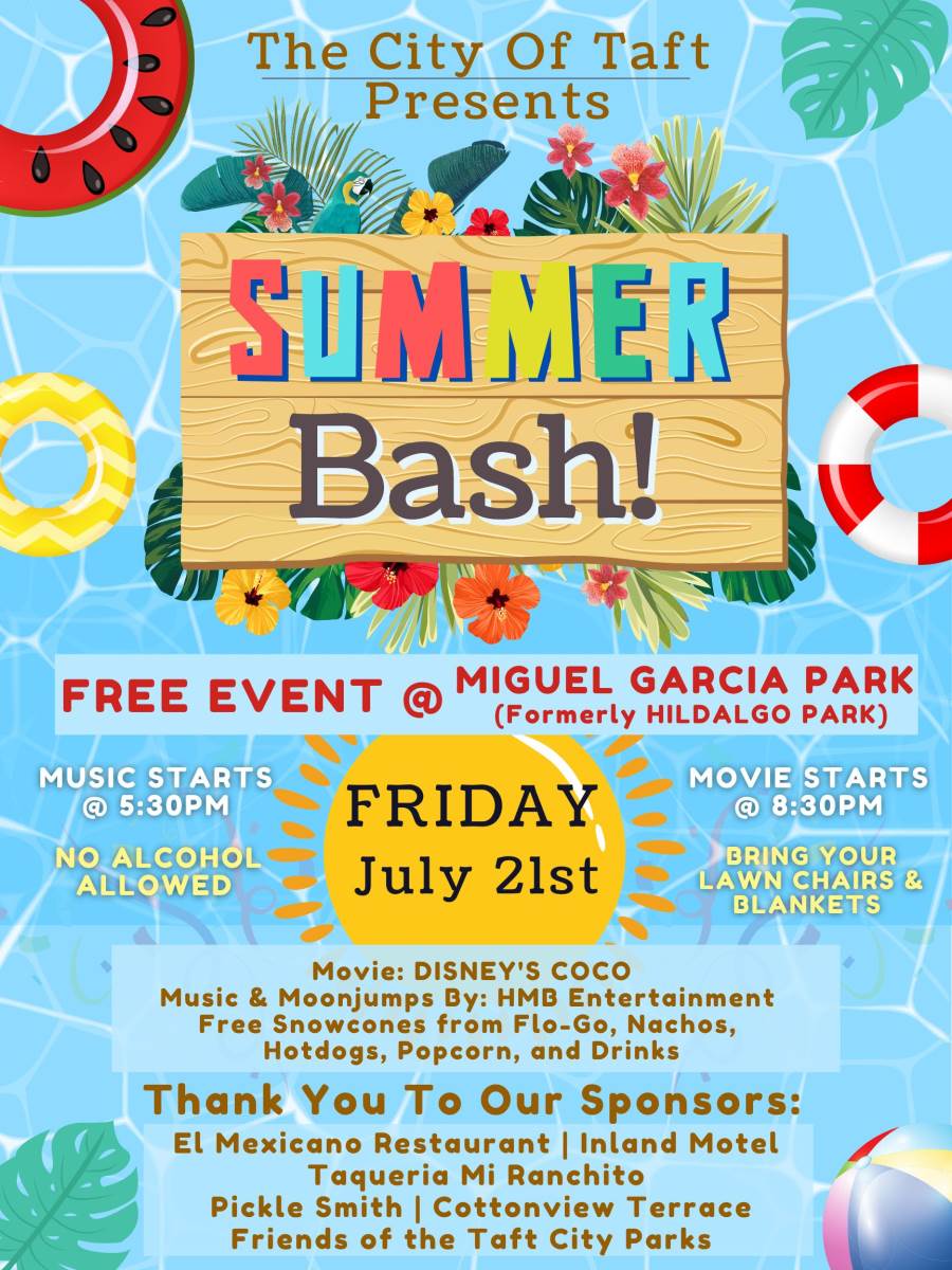 City of Taft residents today is our second Summer Bash taking place this evening. We look forward to seeing many of our community residents, we will have many activities for everyone to enjoy along with FREE food, drinks and other goodies.