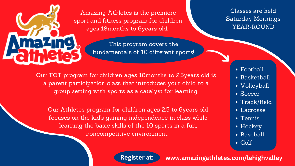 Amazing Athletes is the premiere sport and fitness program for children ages 18 months old to 6 years old. Our program teaches the fundamentals of 10 different sports! Those sports are football, basketball, volleyball, soccer, track/field, lacrosse, tennis, hockey, baseball, and golf.