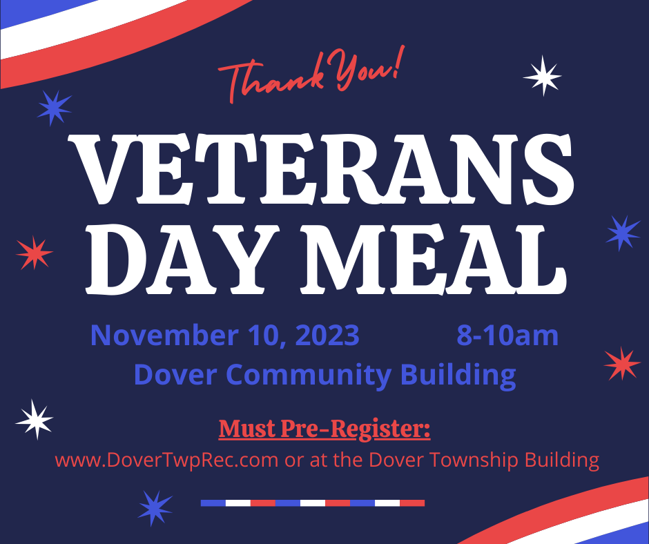 Thank you Veterans! Dover Township is hosting a FREE meal to our Veterans to thank you! Must Pre-register so we know how many to expect and we have enough food.