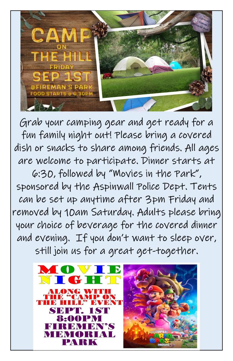 Grab your camping gear and get ready for a fun family night out! Please bring a covered dish or snacks to share among friends. All ages are welcome to participate. Dinner starts at 6:30, followed by “Movies in the Park”, sponsored by the Aspinwall Police Dept. Tents can be set up anytime after 3pm Friday and removed by 10am Saturday. Adults please bring your choice of beverage for the covered dinner and evening. If you don’t want to sleep over, still join us for a great get-together.
