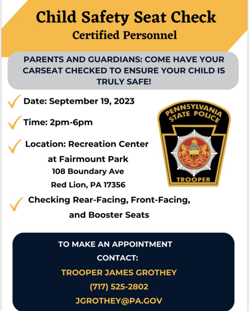 Have your car seat checked by Pennsylvania State Police on Tuesday, September 19th at the Recreation Center at Fairmount Park located at 108 Boundary Avenue. To make an appointment, contact Trooper Grothey at (717) 525-2802.