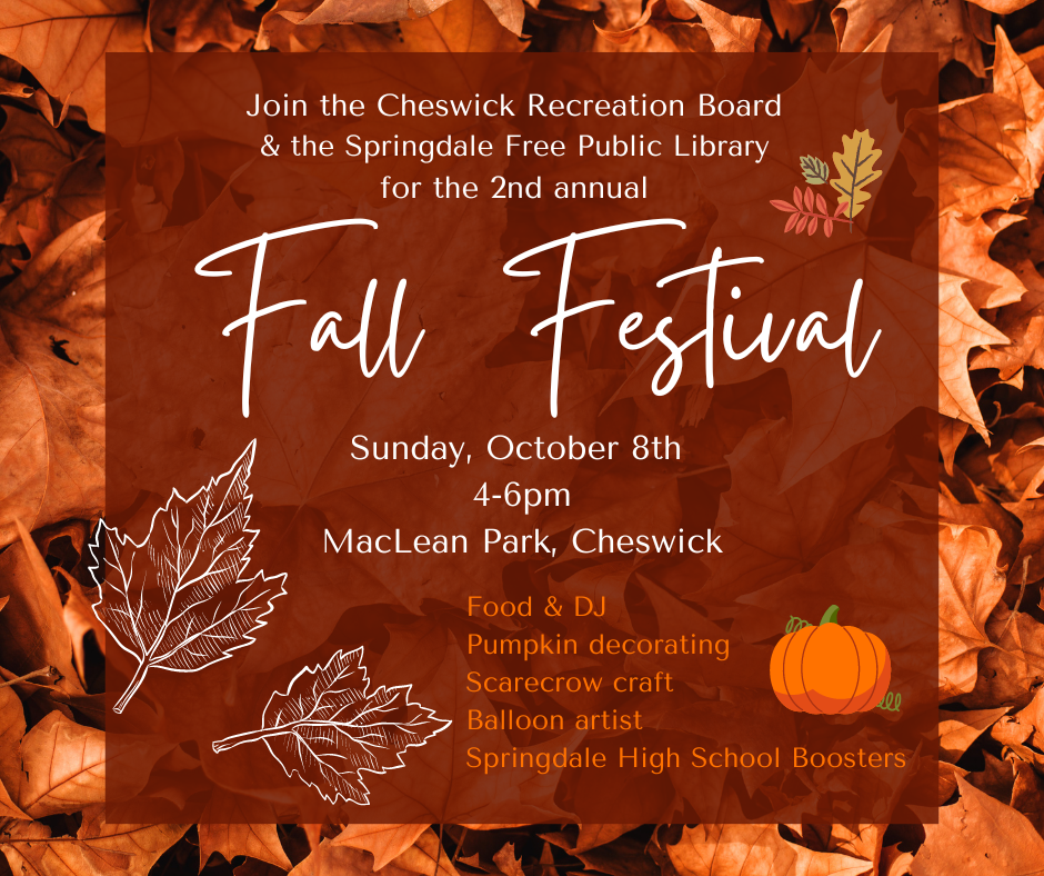 Please join the Cheswick Recreation Board and the Springdale Free Public Library for a FALL FESTIVAL!