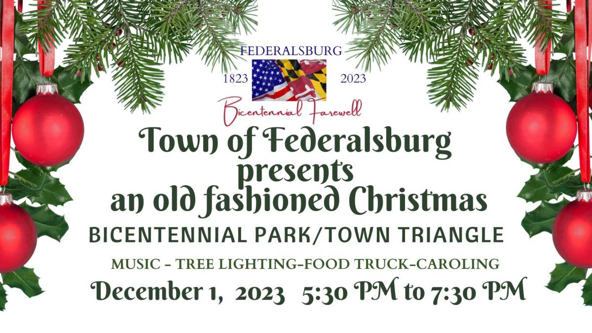 Join the Town of Federalsburg as we say farewell to our Bicentennial Year with our final event of the year. Grab some food from The Red Chef food truck, listen to music, do some caroling, and take pictures with Santa and light the tree.