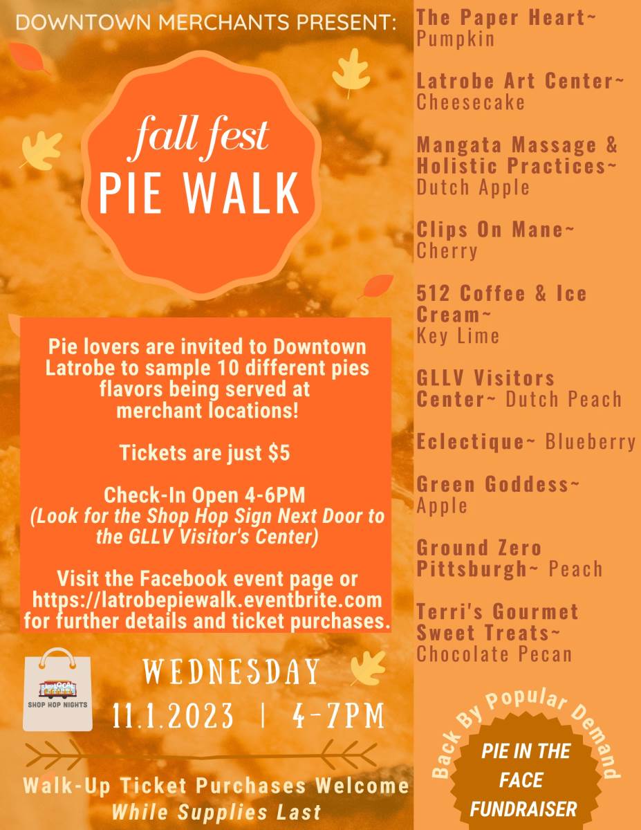 Pie lovers are invited downtown Latrobe to sample 10 different pies being served at local merchants between 4 p.m and 7 p.m. Tickets are $5, Look for Shop Hop Sign next to the GLLV Visitor's Center. At 6:30, Join in on the fun and bid to pie one of our local celebrities, Chief of Police, Richard Bosco, Parks and Recreation Director, Craig Shevchik and local business owner Kara Austin with a pie in a the face!!!