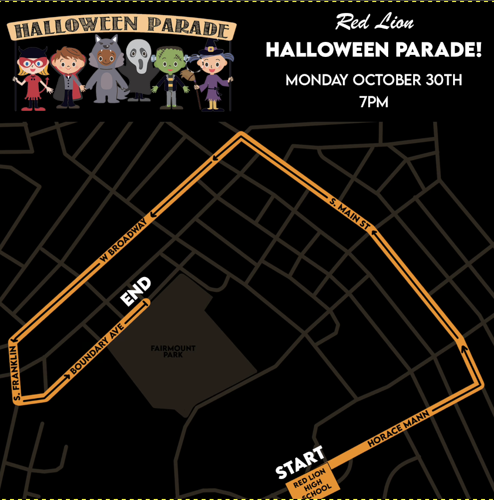 Come out to the annual Red Lion Halloween Parade! Starting at 7 pm at Horace Mann and South Main, turning left at the square onto West Broadway, and ending on Franklin to Boundary Avenue, there will be more than 60 floats! Bring a bag for candy and a comfy spot to sit!