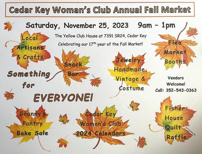 Cedar Key Woman’s Club Annual Fall Market, 9 am-1 pm; also, they will have many Christmas items this year!
