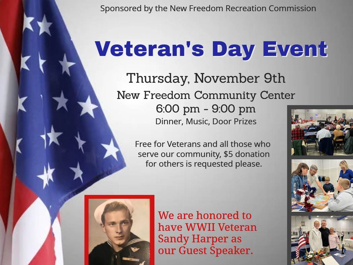 Join us on November 9, 2023 at 6:00PM, for a meaningful Veteran's Day Dinner. We have the honor of hosting a special guest, Sandy Harper, a WWII and Korean War Veteran. To make this event even more special, we're looking for monetary donations, silent auction items, and door prizes. All proceeds from the silent auction and raffle will benefit VFW 7012. If you can contribute in any way, please contact Marianne Michels at newfreedomrecreation@gmail.com. Let's come together to honor our veterans and show our gratitude for their service.