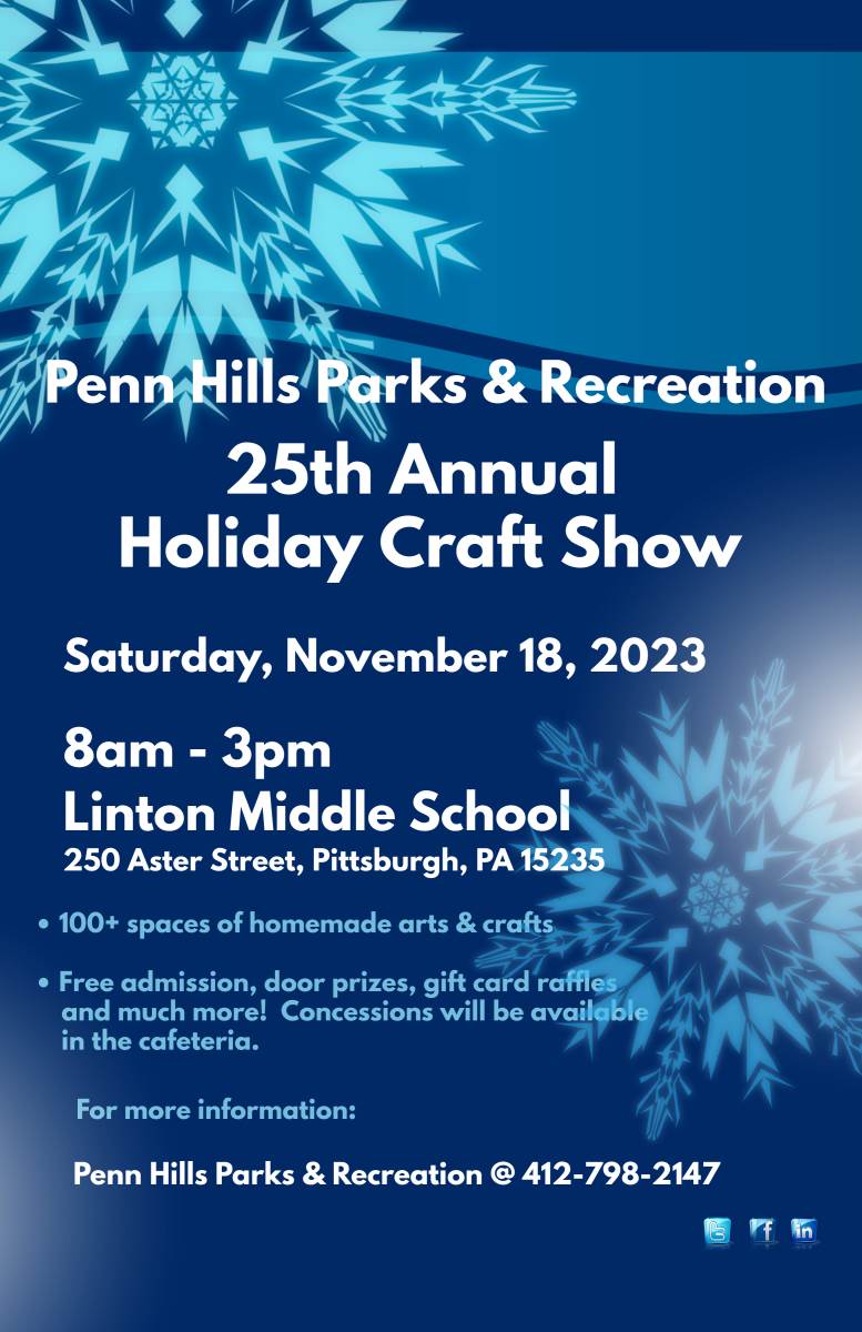 Penn Hills Parks and Recreation is having it 25th Annual Holiday Craft Show on Saturday, November 18th, 2023 between 8:00AM to 3:00PM at Linton Middle School, 250 Aster Street, Pittsburgh, PA 15235. 100+ spaces of homemade arts & crafts. Free Admission, door Prizes, gift card raffles and much more.