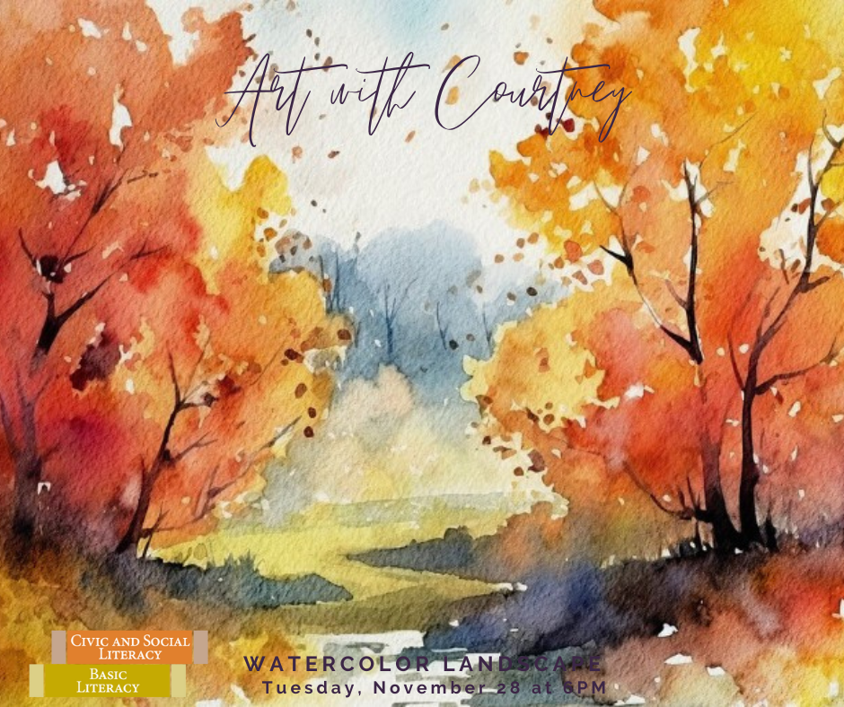 Join us for a fun, in-person program on Tuesday, November 28 at 6 PM. Participants will create a Fall watercolor and ink landscape painting. This program will be lead by Courtney Mealy, Pitt-Bradford’s Director of Arts Programming.