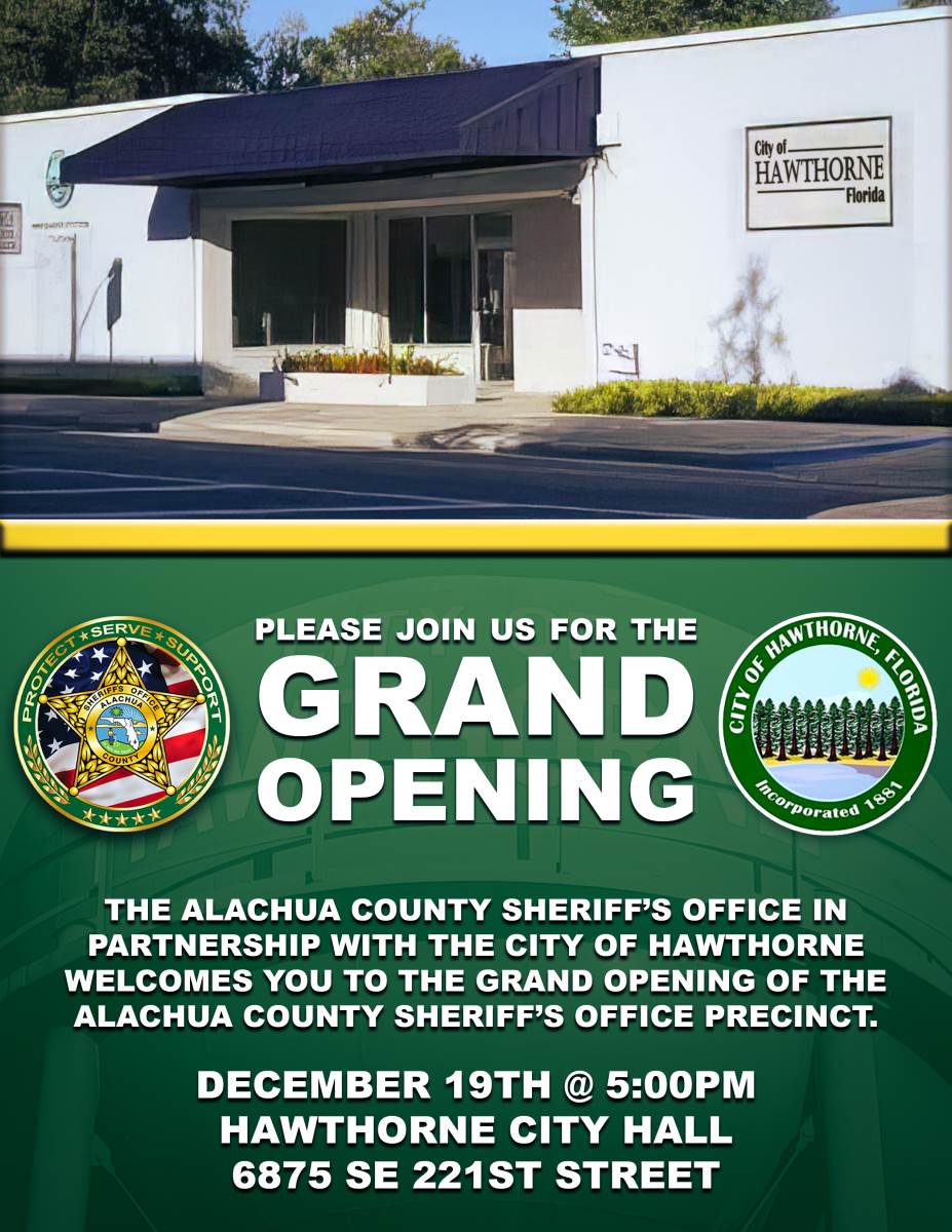 The City of Hawthorne would like to WELCOME Alachua County Sheriff's Office. Alachua County will be opening a substation in the City of Hawthorne; location: City Hall; 6875 SE 221st Street; Hawthorne, FL. 32640