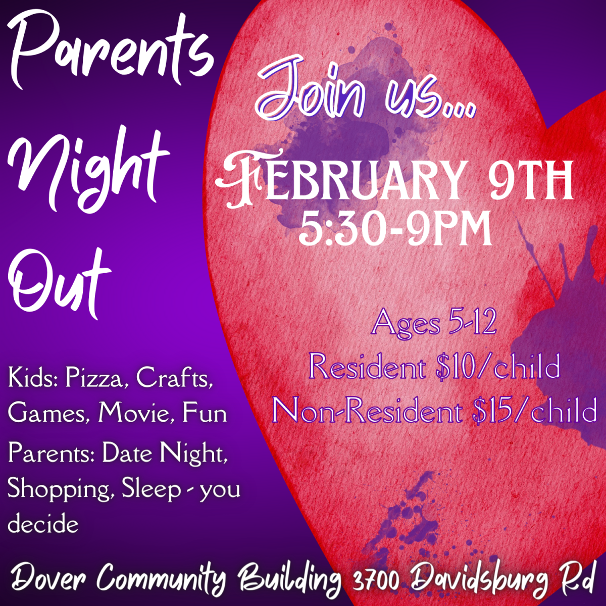 Dover Recreation is having another Parents Night Out on February 9th from 5:30-9pm. Parents drop of your children and go have a night out. Shopping, dinner without the kids or just taking a nap.