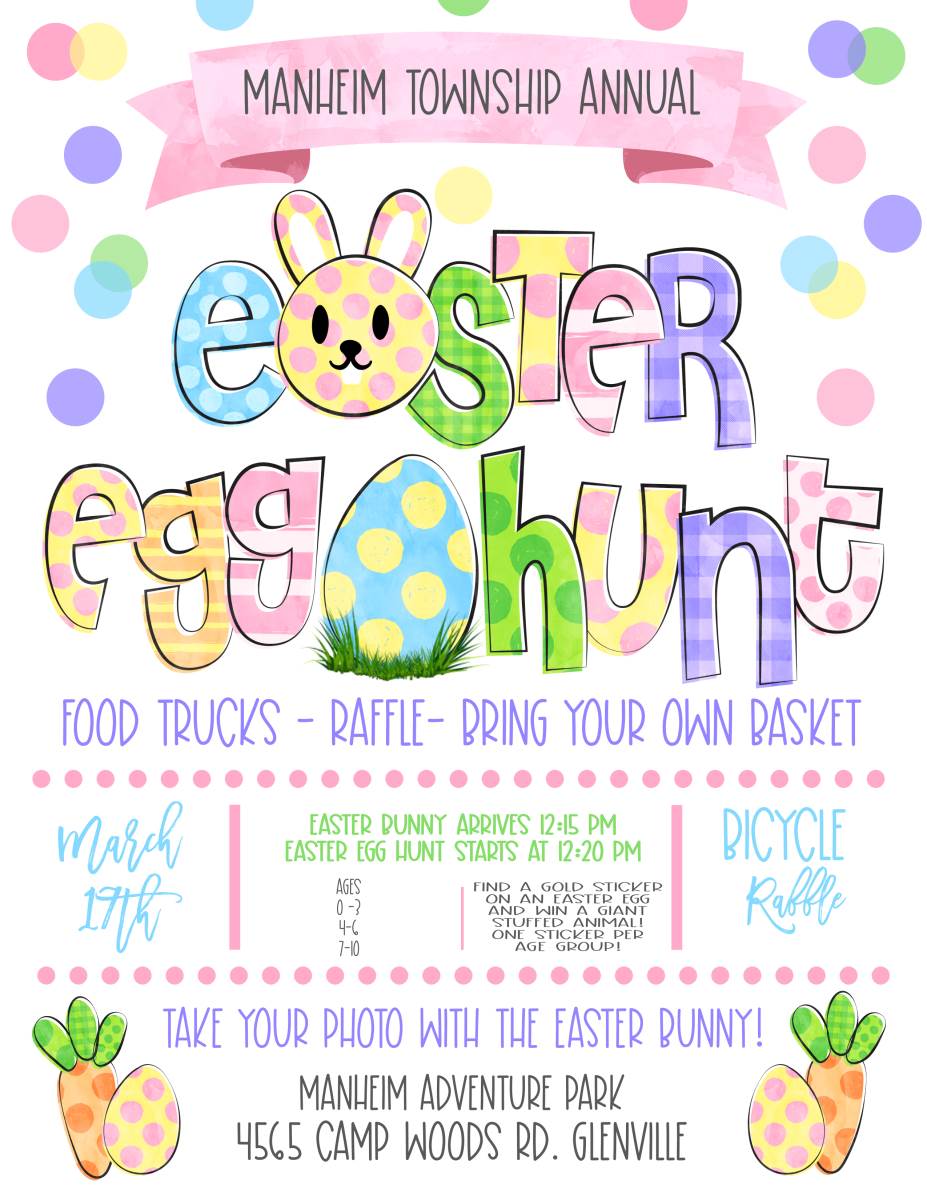 Easter Egg Hunt, Food Trucks, Raffle, Pictures with the Easter Bunny. Bring your own basket.