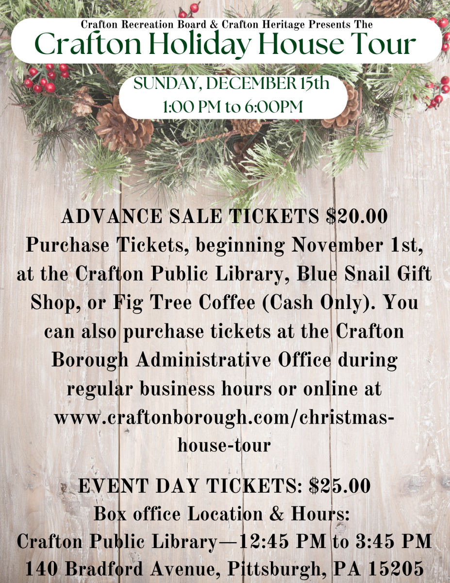 •Advance tickets are $20 and can be purchased starting November 1st at the Crafton Public Library, Blue Snail Gift Shop, or Fig Tree Coffee (cash only), as well as the Crafton Borough Administrative Offices.