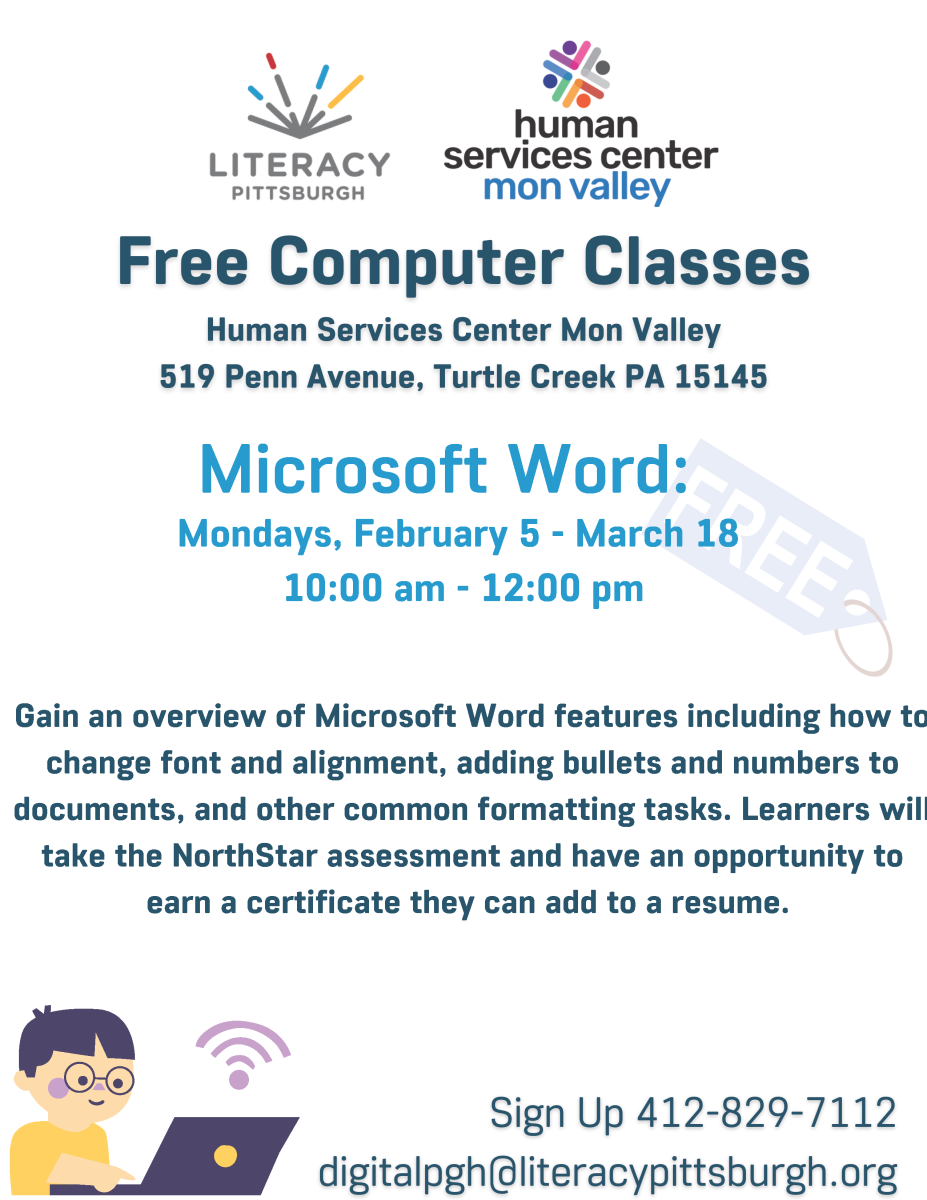 Literacy Pittsburgh will be teaching a multi-week computer class on using Microsoft Word. The class is open to the public, and will take place at the Human Services Center Mon Valley (519 Penn Avenue, Turtle Creek PA 15145). Classes are Mondays (starting February 5th) from 10am-12pm.