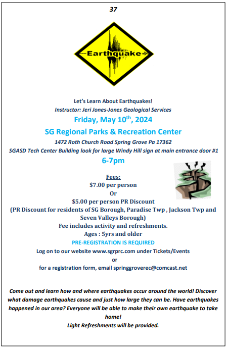 Come out and learn how and where earthquakes occur around the world! Discover what damage earthquakes cause and just how large they can be. Have earthquakes happened in our area? Everyone will be able to make their own earthquake to take home! Light Refreshments will be provided.