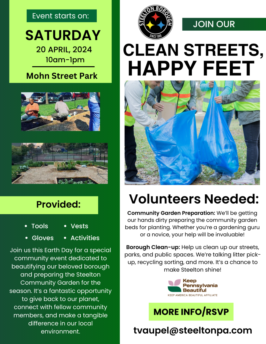 Mark your calendars for Steelton's Earth Day Celebration! Join us for the "Clean Streets, Happy Feet" Community Clean-Up and Garden Preparation on Saturday, April 20th, from 10 AM to 1 PM, at Mohn Street Park. Whether your passion lies in tidying our streets or prepping the community garden for spring, we have the perfect opportunity for you to pitch in. You can lend a hand in one area or both, making a real impact in our community.