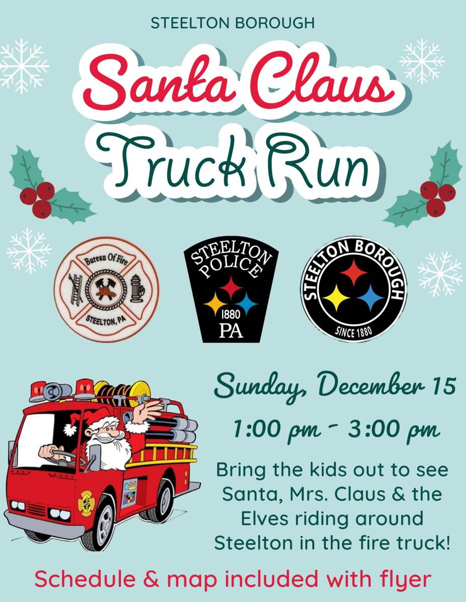 The 2024 Steelton Santa Truck Run will take place on Sunday, December 15 from 1:00 PM to 3:00 PM. Santa, Mrs. Claus, and the elves will be riding around Steelton in the fire truck greeting families! ???????????