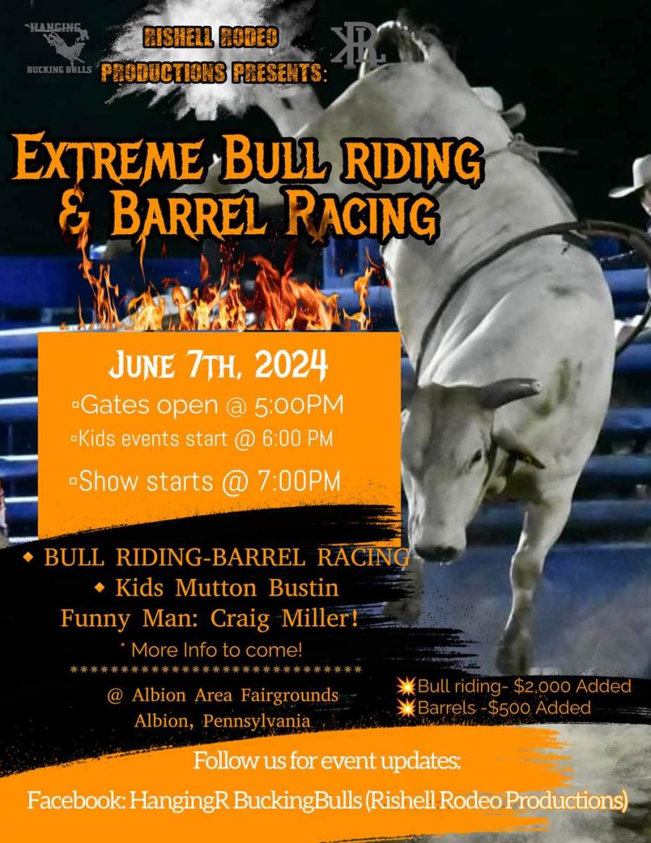 Don't miss out on the thrilling action of Extreme Bull riding, Barrel racing, Mini Bullriding and Kids Mutton busting at the Albion area Fairgrounds