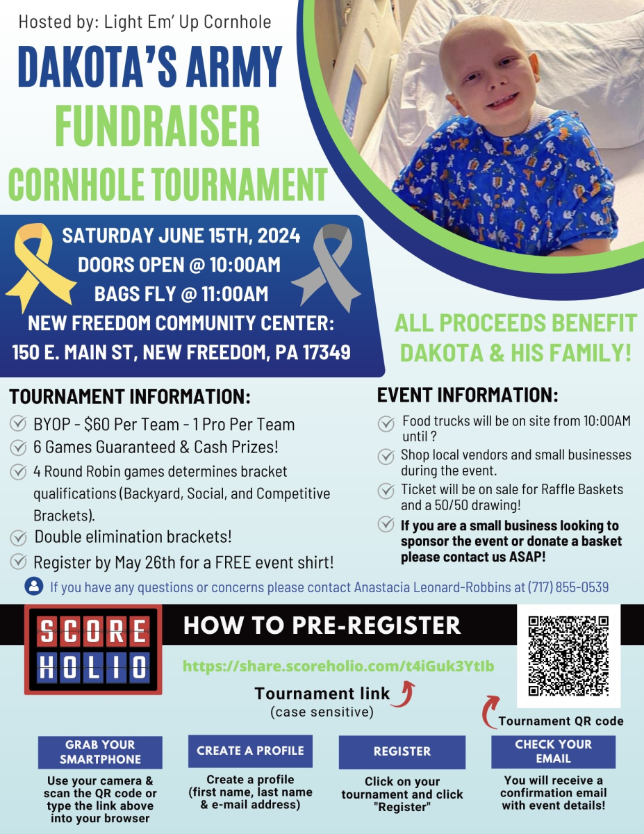 Come out to throw some bags and support a good cause! Dakota Dixon is a local young boy living in Glen Rock. He is currently in Hershey Med battling a very rare and aggressive brain cancer! We have to pull together as his army to help raise money for him and his family!