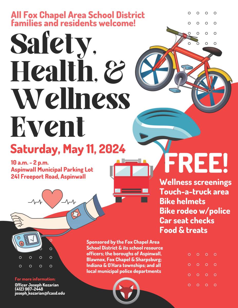 The Fox Chapel Area School District and its school resource officers are event sponsors as are the boroughs of Aspinwall, Blawnox, Fox Chapel, and Sharpsburg, the townships of Indiana and O’Hara plus all of the municipal police. All Fox Chapel Area School District families and residents are welcome to attend the free event.