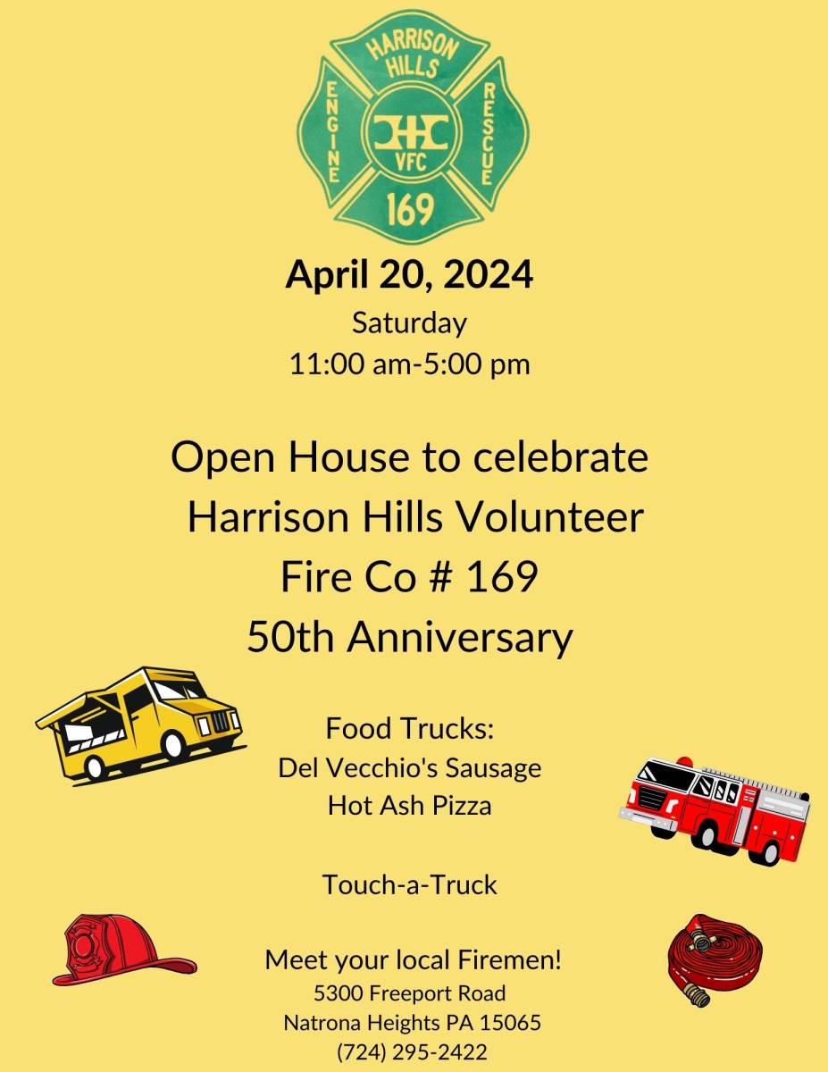 Harrison Hills VFC #169 Invites you to attend their Open House on Saturday, April 20, 2024, from 11:oo am - 5:00 pm. They are having a touch-a -truck and a meet-and-greet with the volunteer firefighters. There will be food trucks from Del Vecchio's and Hot Ash Pizza. Join them in celebrating their 50th Anniversary! Location is 5300 Freeport Road, Natrona Heights.