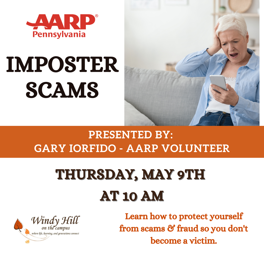 Windy Hill on the Campus will be holding an AARP Imposter Scam presentation on Thursday, May 9th at 10am.
