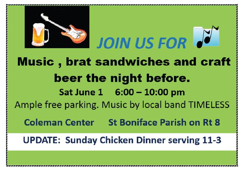 Kick off the Summer Festival the night before: music, brat sandwiches and craft beer! From 6-10pm at the Saint Boniface Coleman Center