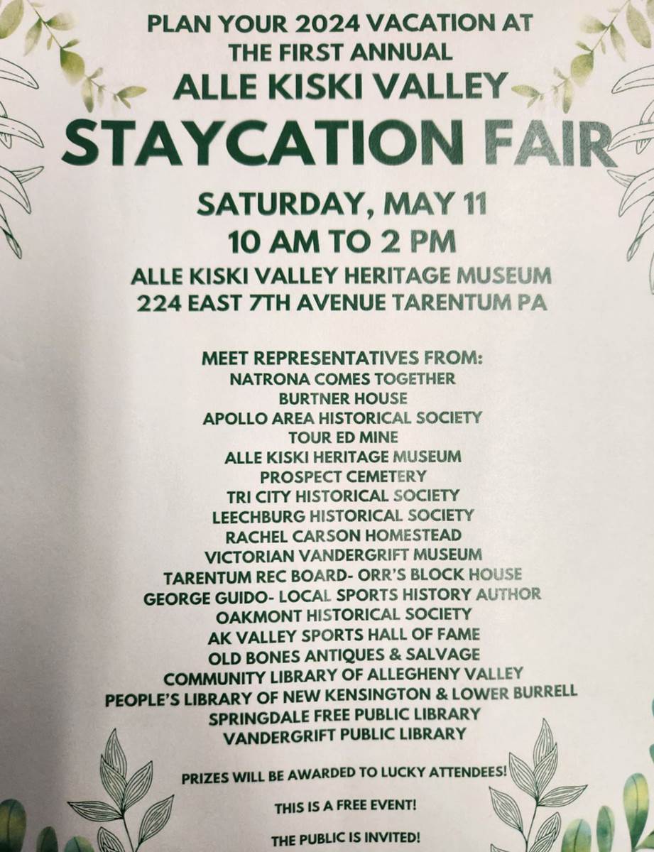 The free Staycation Fair will be held from 10 a.m. to 2 p.m. Saturday, May 11, at the Alle-Kiski Valley Heritage Museum, 224 E. Seventh Ave.