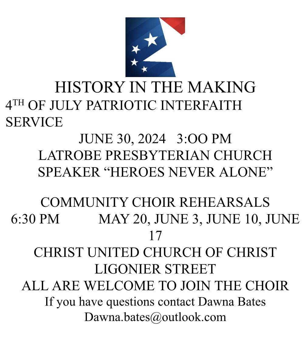 Annual 4th of July Patriotic Interfaith Service, Sunday, June 30th, 3 p.m. Latrobe Presbyterian Church, Main Street, Latrobe.
