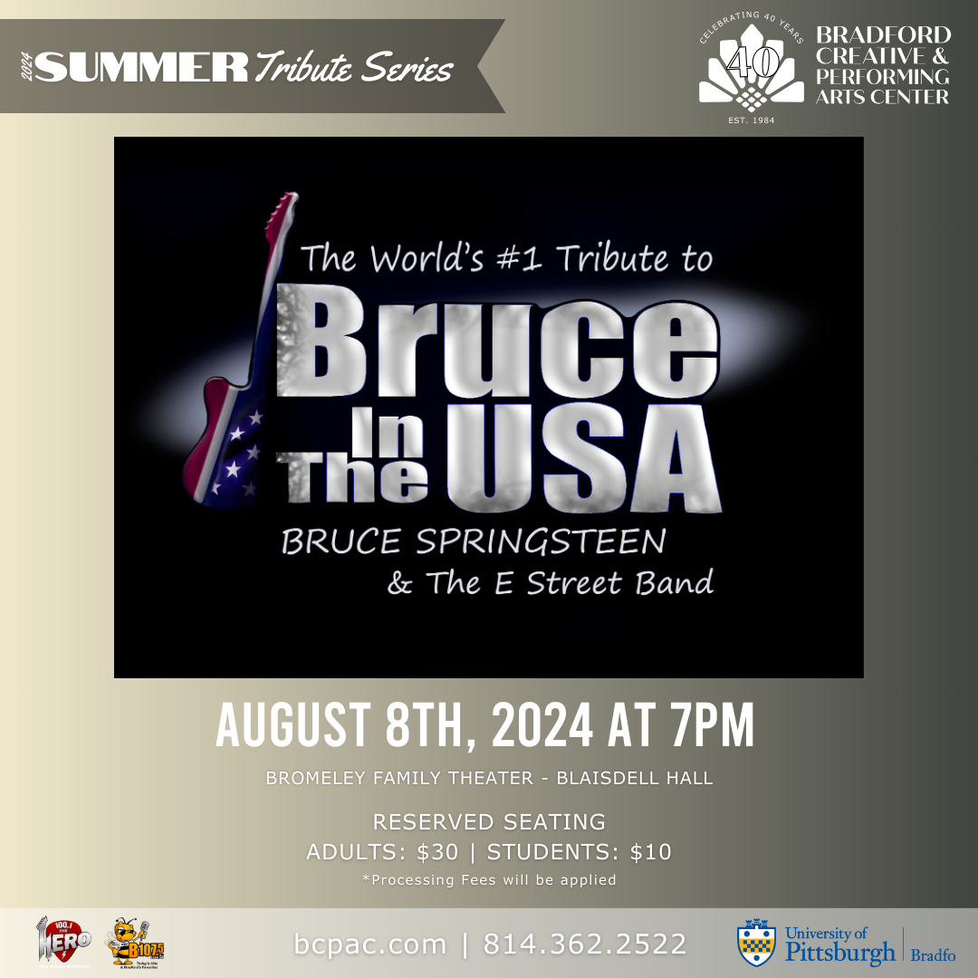 Bradford Creative and Performing Arts Center hosts a hot summer tribute lineup for their 40th Anniversary Season with one last tribute show to Bruce Springsteen. It's going to be a sizzling summer at the Bromeley Family Theater! The series wraps up with Bruce in the USA - The World's #1 Tribute to Bruce Springsteen and the E Street Band.