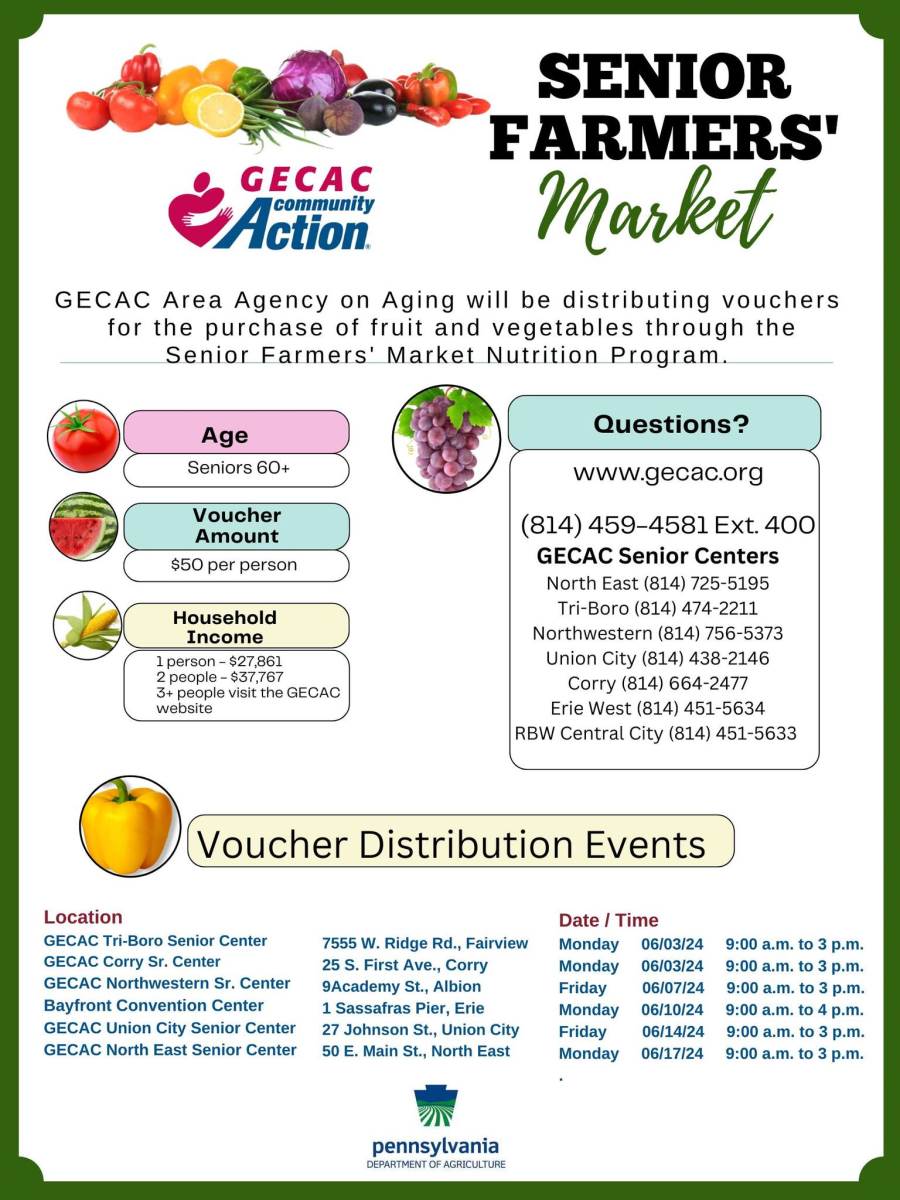 GECAC Area Agency on Aging will be distributing vouchers for the purchase of fruit and vegetables through the Senior Farmers' Market Nutrition Program.