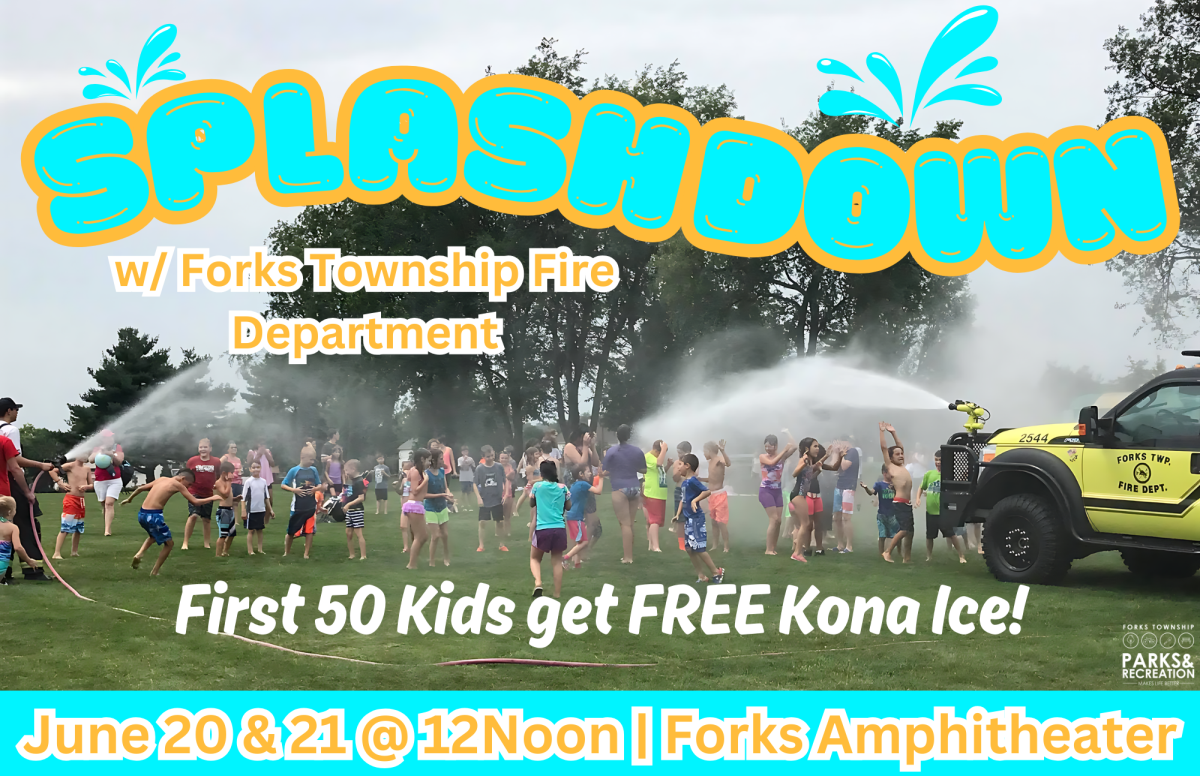 Beat the Heat with our Forks Township Fire Dept this Thursday and Friday at the Forks Township Amphitheater Area! Our Volunteer Firefighters will be on-site spraying down anyone who joins us! SPLASHDOWN begins at Noon and will last approximately 60-90minutes!