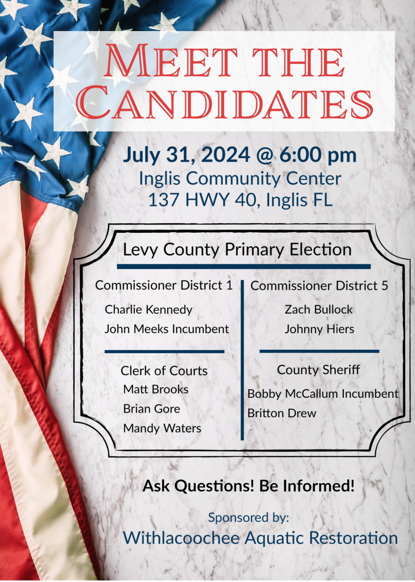 Come out and meet the Levy County Candidates July 31, 2024 @ 6PM. See attachment for more information.