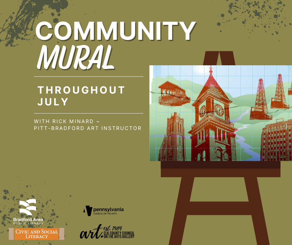 Local artist and Pitt-Bradford instructor, Rick Minard, is the consulting artist for a special mural that BAPL is undertaking in July. This mural of 120 mini-pictures will be pieced together to reveal well known landmarks from our town. Be a part of this creative and historic project. All skill levels welcome. Choose from three (3) remaining dates to participate (July 18, 22, and 29). Registration is easy and necessary. Just visit this link to select your date and self-register: https://bradfordlibrary.org/news-events/