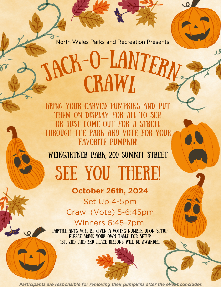 Join us for a Jack-o-Lantern Crawl through Weingartner Park. Whether you are submitting a pumkin or simply strolling through to vote for your favorite, all are welcome. Pumpkins can be entered beginning at 4:30pm and the crawl will run from 5:00pm to 7:00pm.