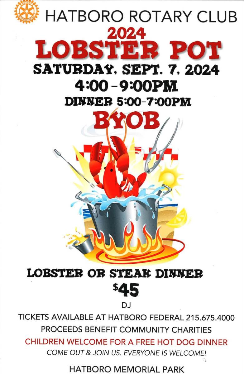 Hatboro Rotary Club Presents: 2024 Lobster Pot. Saturday, September 7, 2024, 4-9pm, Hatboro Memorial Park