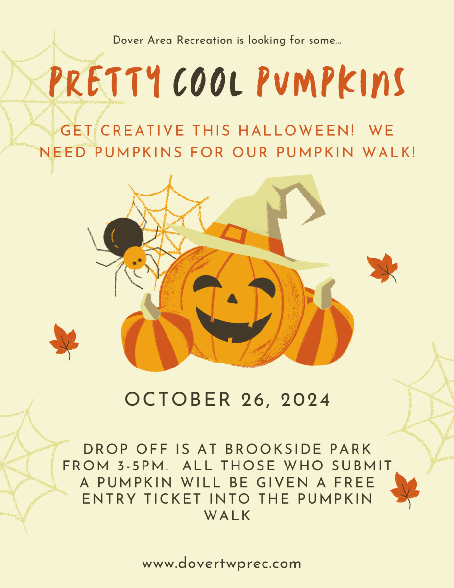 PUMPKINS NEEDED! If you want to create a carved or painted pumpkin and donate it to our pumpkin walk please bring your pumpkin(s) to Brookside on October 26th from 3-5pm.