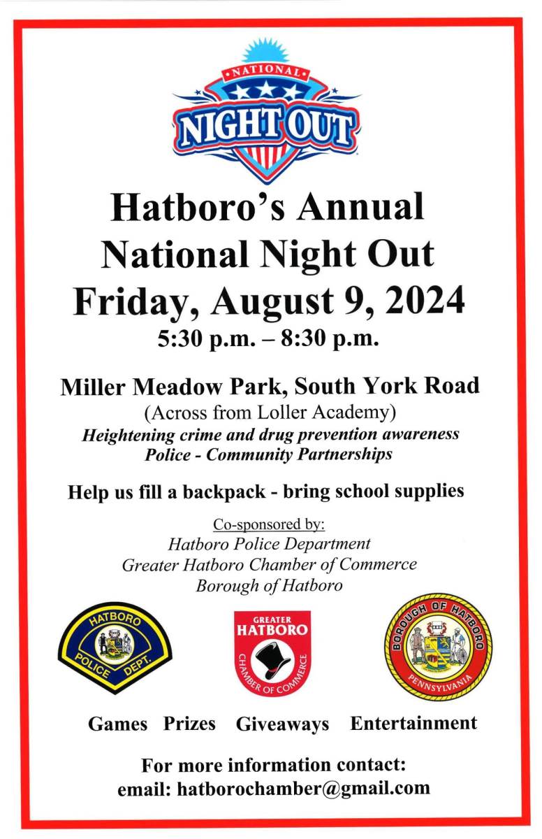 The Greater Hatboro Chamber of Commerce, Hatboro Police Department and the Borough of Hatboro are pleased to announce co-sponsorship of Hatboro's annual National Night Out on Friday August 9, 2024, from 5:30 pm to 8:30 pm. This free, family-friendly event will be held at Miller Meadow Park, South York Road (at York and Horsham Road)