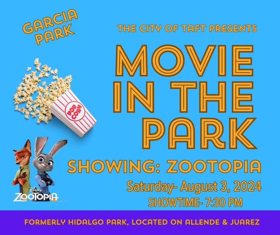 Please join us this Saturday, August 3 at Garcia Park, for a showing of Zootopia. Showtime is 7:30 pm.