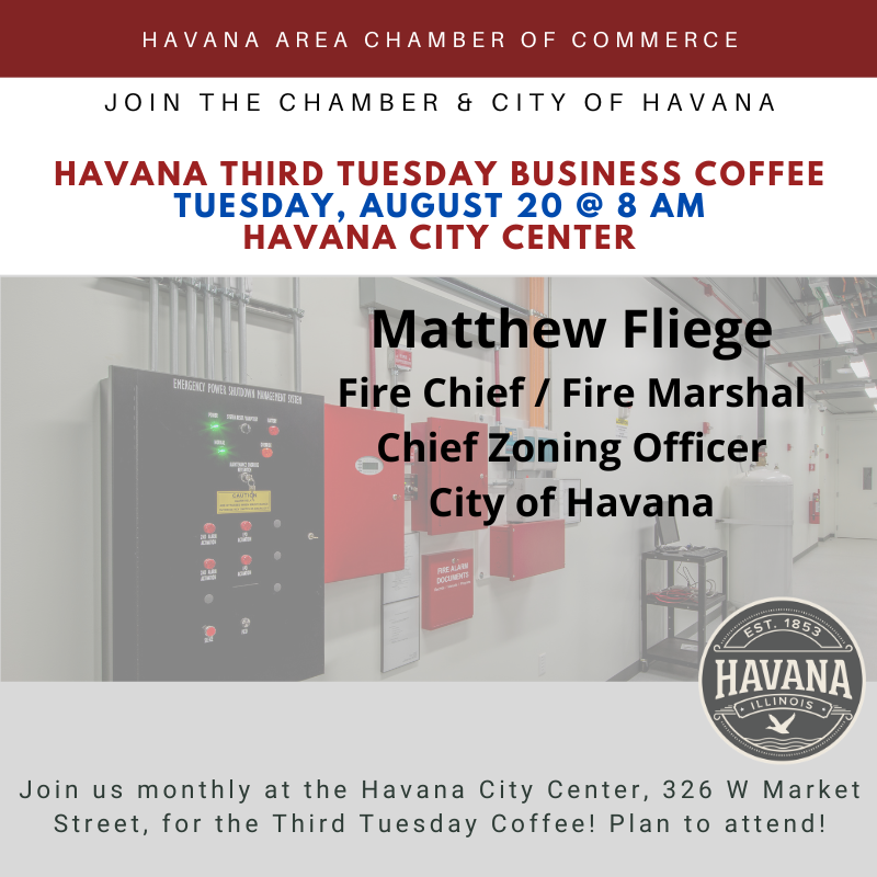 Join us for the Third Tuesday Coffee and take advantage of this unique networking opportunity. Get updates from the City of Havana and the Chamber of Commerce and share information on your business or organization. Plan to attend!