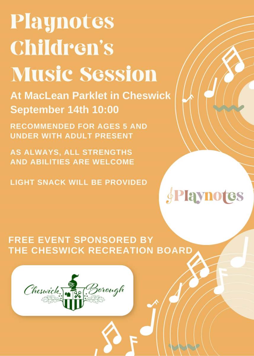 Join us for a fun-filled event sponsored by the Cheswick Recreation Board! Playnotes is coming to town, bringing a lively and interactive children's music session right here in Cheswick!