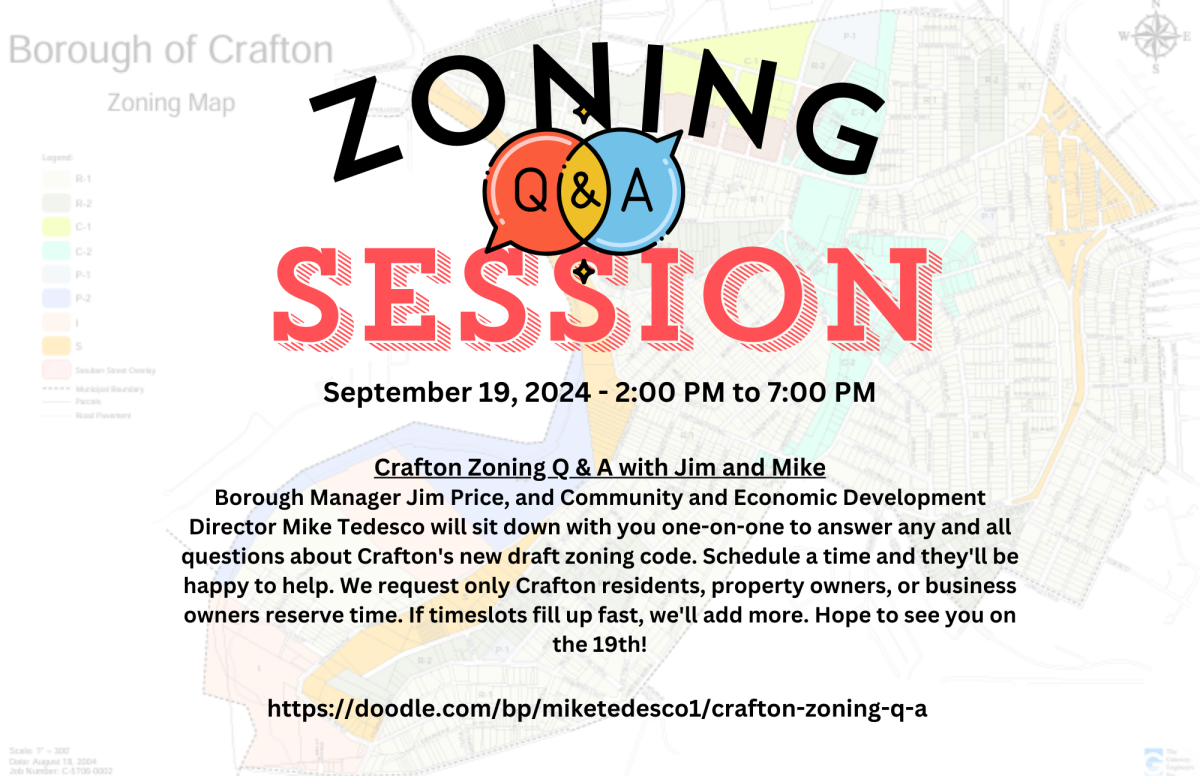 Borough Manager Jim Price, and Community and Economic Development Director Mike Tedesco will sit down with you one-on-one to answer any and all questions about Crafton's new draft zoning code. Schedule a time and they'll be happy to help. We request only Crafton residents, property owners, or business owners reserve time. If timeslots fill up fast, we'll add more. Hope to see you on the 19th!