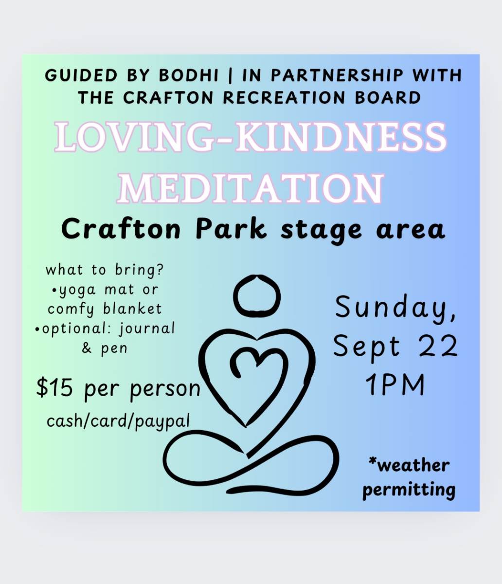 Crafton Recreation Board would like to introduce you to Bodhi. She is a Crafton resident and she is 200HR-RYT Certified Yoga and Meditation Instructor. She will be bringing Meditation to Crafton Park. Her guided meditation is called "Loving-Kindness" and " the values are based in feeling self love and care, while also spreading that same love and care to the members of our community, no matter who they are."